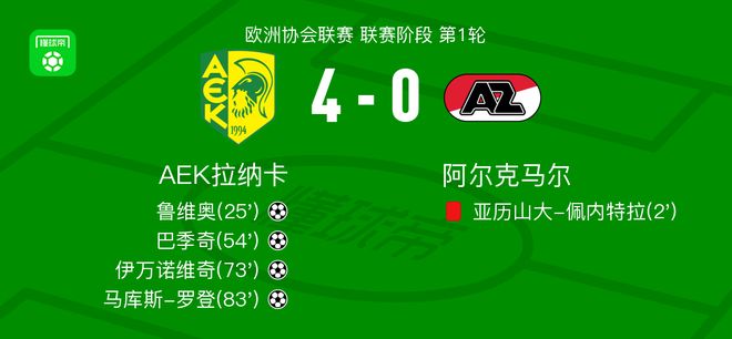 10月3日,北京的时代在欧洲协会联盟的第一轮中面临着Aek Larnaca。在游戏开始时,亚历山大透过Alkemaar玩家被红牌发送,这使团队从一开始就处于数值劣势。 Aek Larnaca抓住了机会,Ruvio首先得分并领导球队。格斯·莱德斯(Gus Ledes)随后提供了帮助,并在巴吉克(Badjic)接球后得分,进一步扩大了他的得分。在下半场,Chacon精确地将球传球,从而使Ivanovic得分另一个进球。在比赛结束时,Miricevic帮助Marcus Roden完成了进球并阻止了得分。最后,Aek Larnaca以4-0击败了对手。在两分钟的令人难以置信的时刻,Alkemaar团队亚历山大(Alexander)渗透到了红牌。在第25分钟,Aek Larnaca Ravio球员攻入了进球。在第54分钟,Aek Larnaca Gus Ledes帮助Badjic得分了。 Janl Minuto 73,Aek Larnaca Chakon球员帮助了IvanoviC得分。在第83分钟,Aek Larnaca Milicevic为马库斯·罗登(Marcus Roden)进球。设备对齐的技术统计数据
