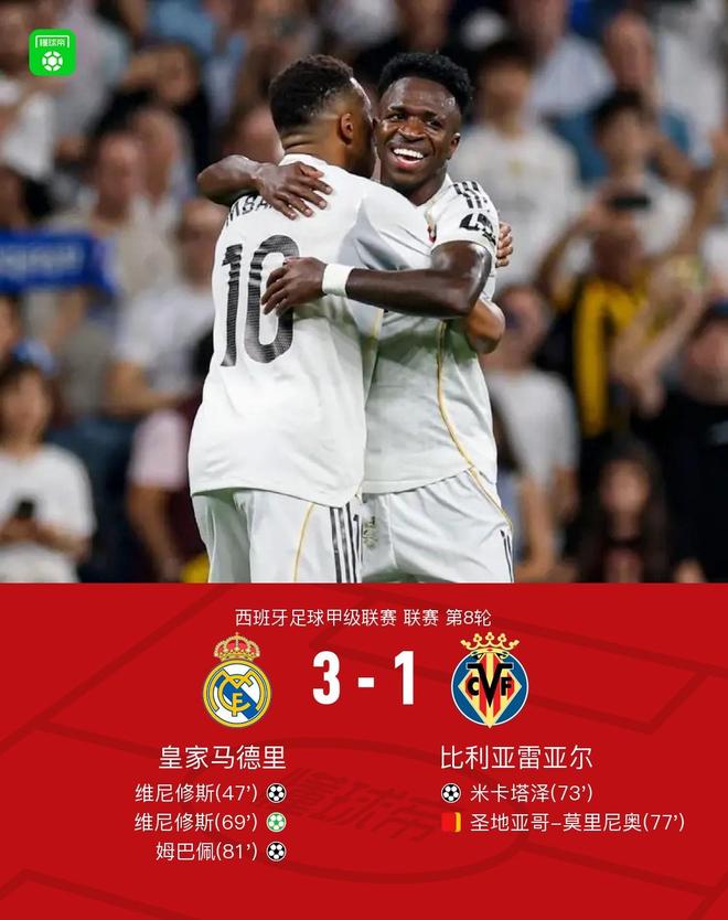 10月5日,西班牙足球联赛的第八轮皇家马德里在家里面对比利亚雷亚尔。在上半场,没有一个球队取得任何成绩。在下半场,Vinicius的镜头在网络中折射。巴西随后做了一个男人,接受了个人罚款并打了她。 Vinicius被莫利诺(Molino)打破并拆除,后者在收到第二张黄牌后被交换。婆罗门获得了无私的帮助,Mbappe得分。在比赛结束时,皇家马德里以3-1击败比利亚雷亚尔。在关键赛事的第47分钟,Vinicius的射门被折射到了网络上,在第69分钟,皇家马德里1-0,Vinicius创造了观点并亲自参与。皇家马德里在第72分钟赢得了2-0的比赛,Mikataze得分,皇家马德里在第78分钟以2-1的比分,莫利尼击败Vinicius并击败了Vinicius并派出81分钟,Brahim无私参加,Mbappe Madrid在四分钟内开始。 Mustuntono在旁边尝试了Alguien,但Vega在第7分钟成功解决了。 Mbappe de肝脏把球,古莱尔射出了18分钟。相机被交付给观众。阿诺德(Arnold)在第20分钟看到了比赛。姆巴佩(Mbappe)走了下来,跌倒在地并开枪,但在第21分钟被黄方守门员没收。 Vinicius从一侧越过十字架,Chu Meni在22分钟内接了一个小球。 Mbappe无私地传球,Mastanton的投篮迟到了。警卫队挡住了27分钟,穆斯托诺(Mustantono)越过十字架,在第37分钟,楚梅尼(Chu Meni)击败了球,而格雷尔(Gerel)则以任意球击中墙,第41分钟丢失了球,他丢失了Orvasey的射击,而Kotewa则确保球门在第47分钟内没有错过。他给了他球,在第62分钟,Pepe进入了进球,而Mika Taze直到第64分钟才打球。皇家马德里在罚款中取代了贝灵汉和卡马维瓦加。皇家马德里在第72分钟以2-0进球。 Mikataze攻入了进球。皇家马德里在第78分钟以2-1获得。莫Inho击败了Vinicius,并被送往第二个黄色字母。在第81分钟,婆罗门提供了无私的帮助和MBAPPE得分,以及皇家马德里的技术统计3-1团队阵容统计